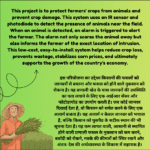 This project is to protect farmers’ crops from animals and prevent crop damage. This system uses an IR sensor and photodiode to detect the presence of animals near the field. When an animal is detected, an alarm is triggered to alert the farmer. The alarm not only scares the animal away but also informs the farmer of the exact location of intrusion. This low-cost, easy-to-install system helps reduce crop loss, prevents wastage, stabilizes corn prices, and ultimately supports the growth of the country’s economy.