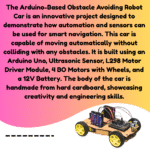 The Arduino-Based Obstacle Avoiding Robot Car is an innovative project designed to demonstrate how automation and sensors can be used for smart navigation. This car is capable of moving automatically without colliding with any obstacles. It is built using an Arduino Uno, Ultrasonic Sensor, L298 Motor Driver Module, 4 BO Motors with Wheels, and a 12V Battery. The body of the car is handmade from hard cardboard, showcasing creativity and engineering skills.
