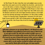 In This Project We show when Day start and sunlight came on solar panel then solar panel convert the sunlight into electricity ,and electricity store in the battery so battery charge that storage electricity power we use night time when sunlight not available ,In This Project we show when sunlight go and darkness come means Night Start The LDR sensor sense the darkness and turn on the street light electricity button so street light on and start glowing and mange road darkness ,So This is Best working Project For showing Solar Charging Base Automatic ON-Off Street Light System and this is 100% full working project so this project idea we can use in real life ,Our Project Idea Is best for showing working project.